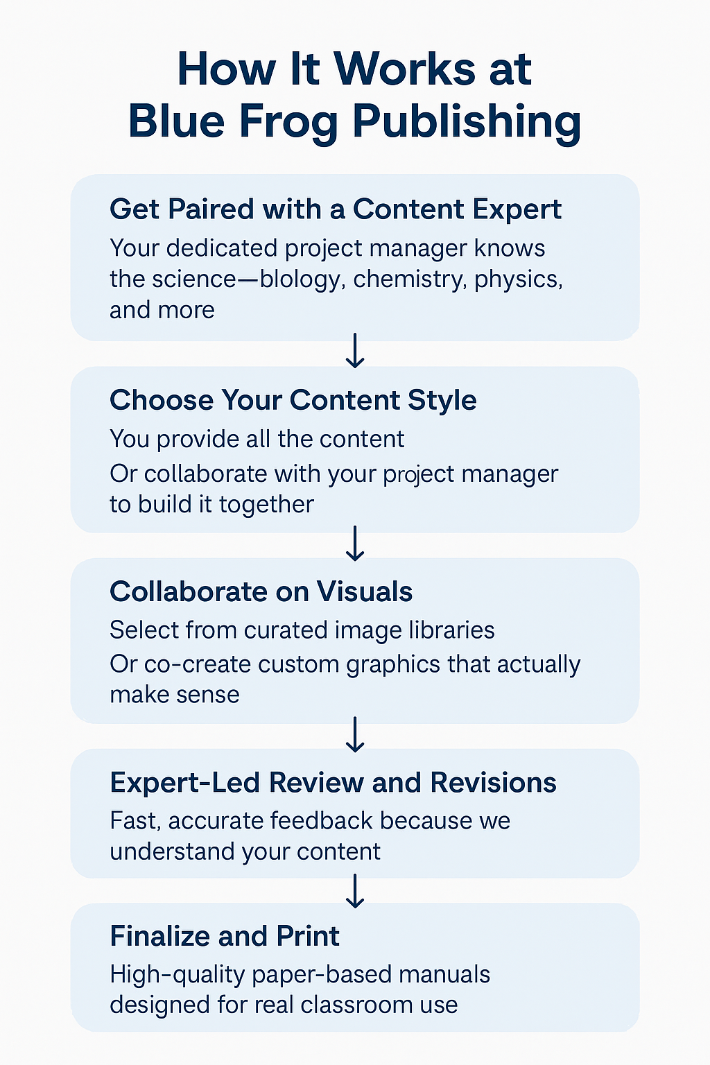 We do things differently. When you work with us, you're not passed around between departments or left explaining scientific concepts to someone unfamiliar with your field. Instead, you’re paired with a dedicated project manager who is also a content expert—someone trained in biology, chemistry, physics, or the subject your lab manual covers.